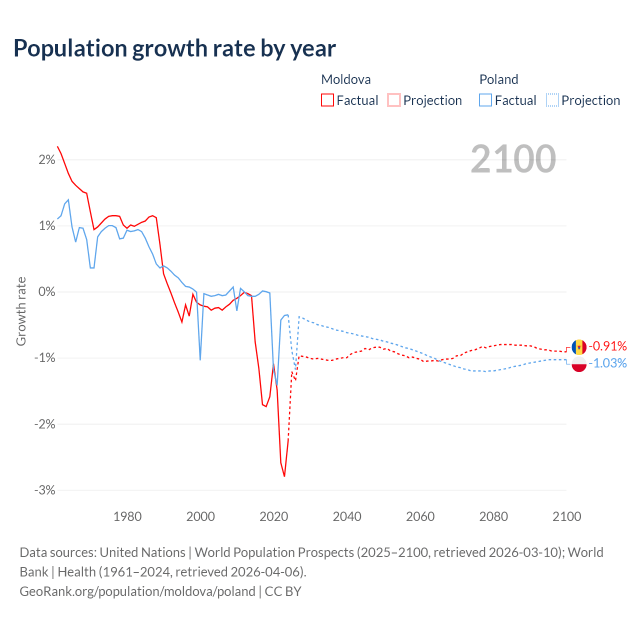 - For the last 10 years, Moldova has had an average growth rate of -1.57% per year vs -0.36% in Poland.