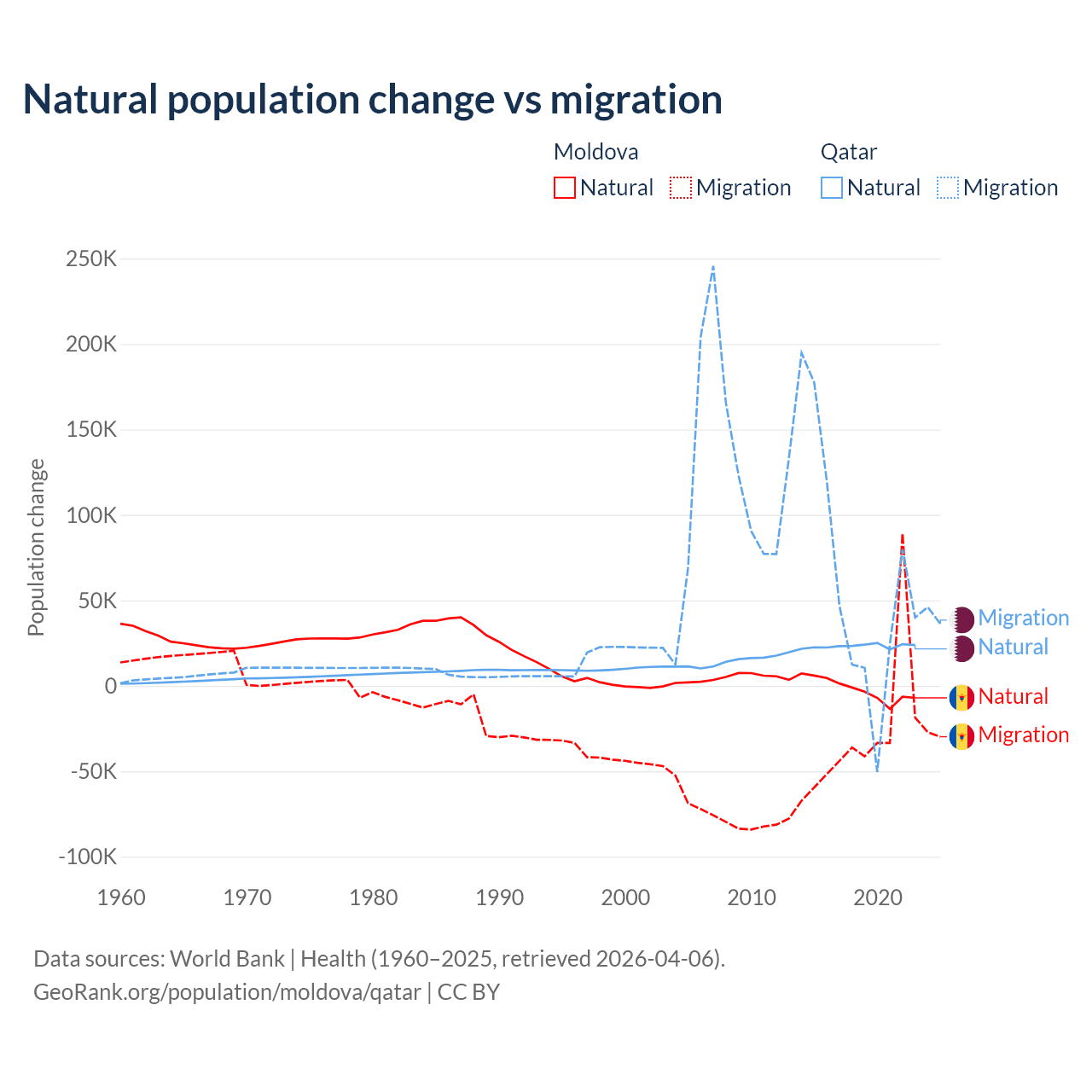 Over the last 10 years, 6.04% of the population change in Moldova is from natural causes (a loss of 19,001 people) and 94% is from migration (a loss of 295,631 people). In Qatar 26.1% is from natural causes (a gain of 232,009 people) and 73.9% is from migration (a gain of 655,712 people).