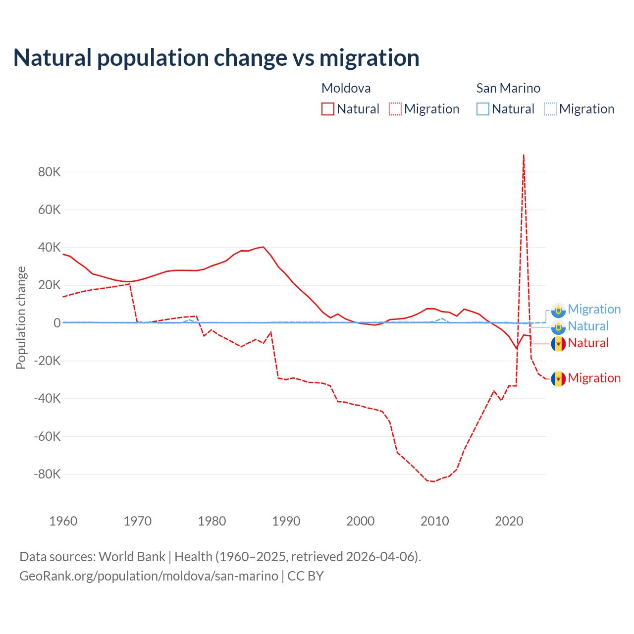 Over the last 10 years, 6.04% of the population change in Moldova is from natural causes (a loss of 19,001 people) and 94% is from migration (a loss of 295,631 people). In San Marino 40.9% is from natural causes (a loss of 358 people) and 59.1% is from migration (a gain of 517 people).