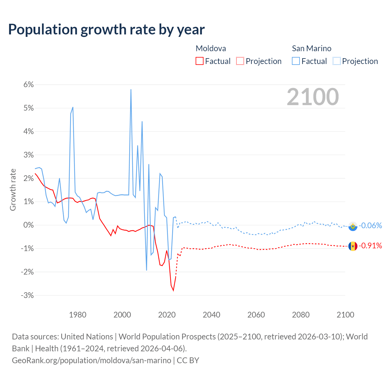 - For the last 10 years, Moldova has had an average growth rate of -1.57% per year vs +0.26% in San Marino.