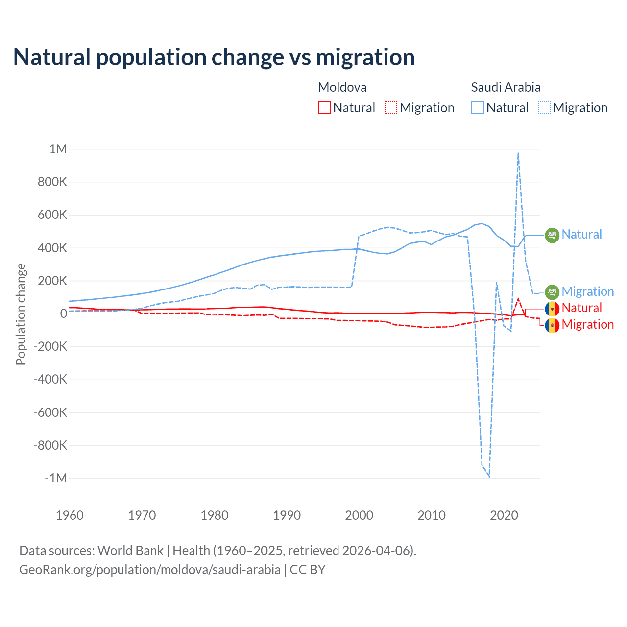 Over the last 10 years, 6.04% of the population change in Moldova is from natural causes (a loss of 19,001 people) and 94% is from migration (a loss of 295,631 people). In Saudi Arabia 93.9% is from natural causes (a gain of 4,829,562 people) and 6.05% is from migration (a gain of 311,209 people).
