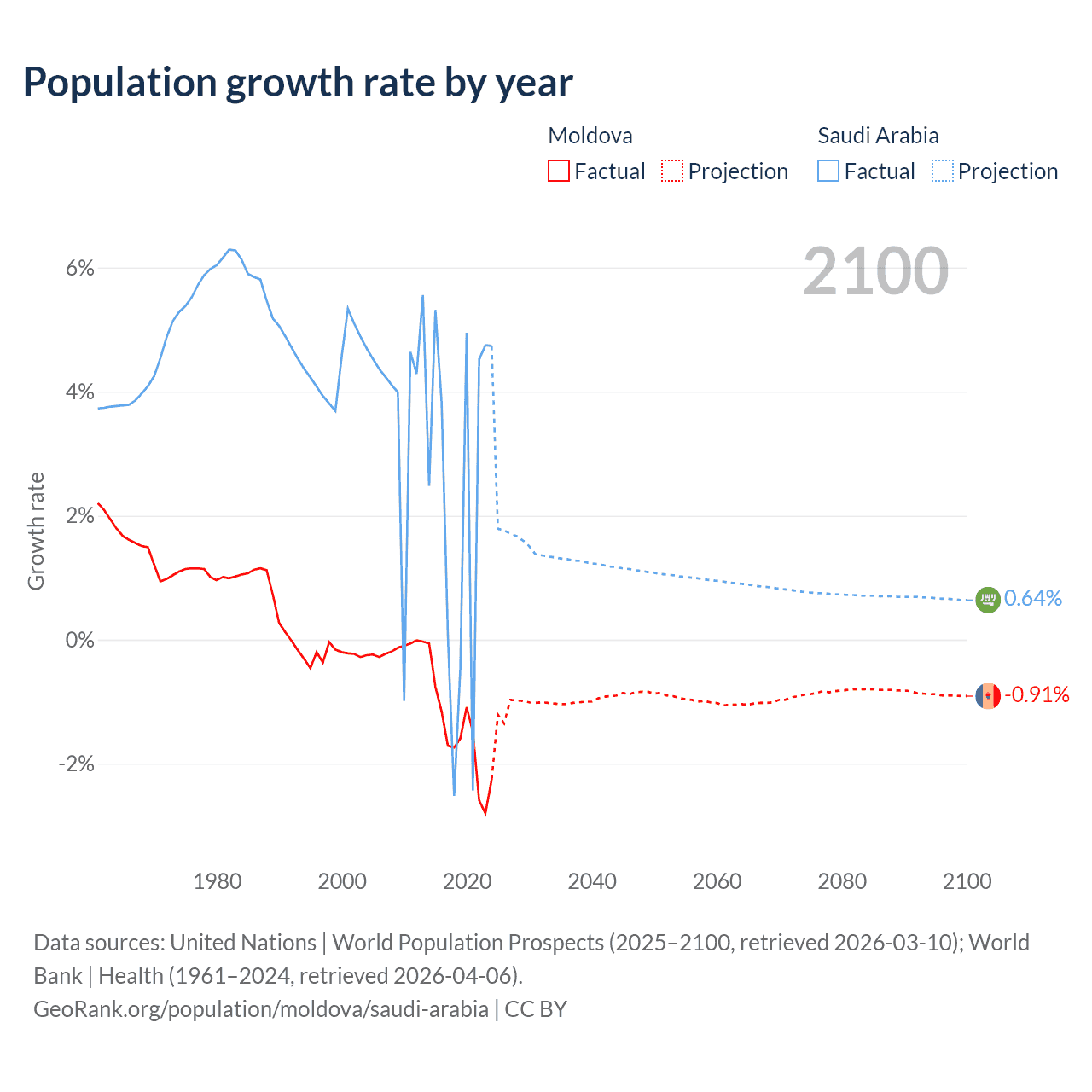 - For the last 10 years, Moldova has had an average growth rate of -1.57% per year vs +2.3% in Saudi Arabia.