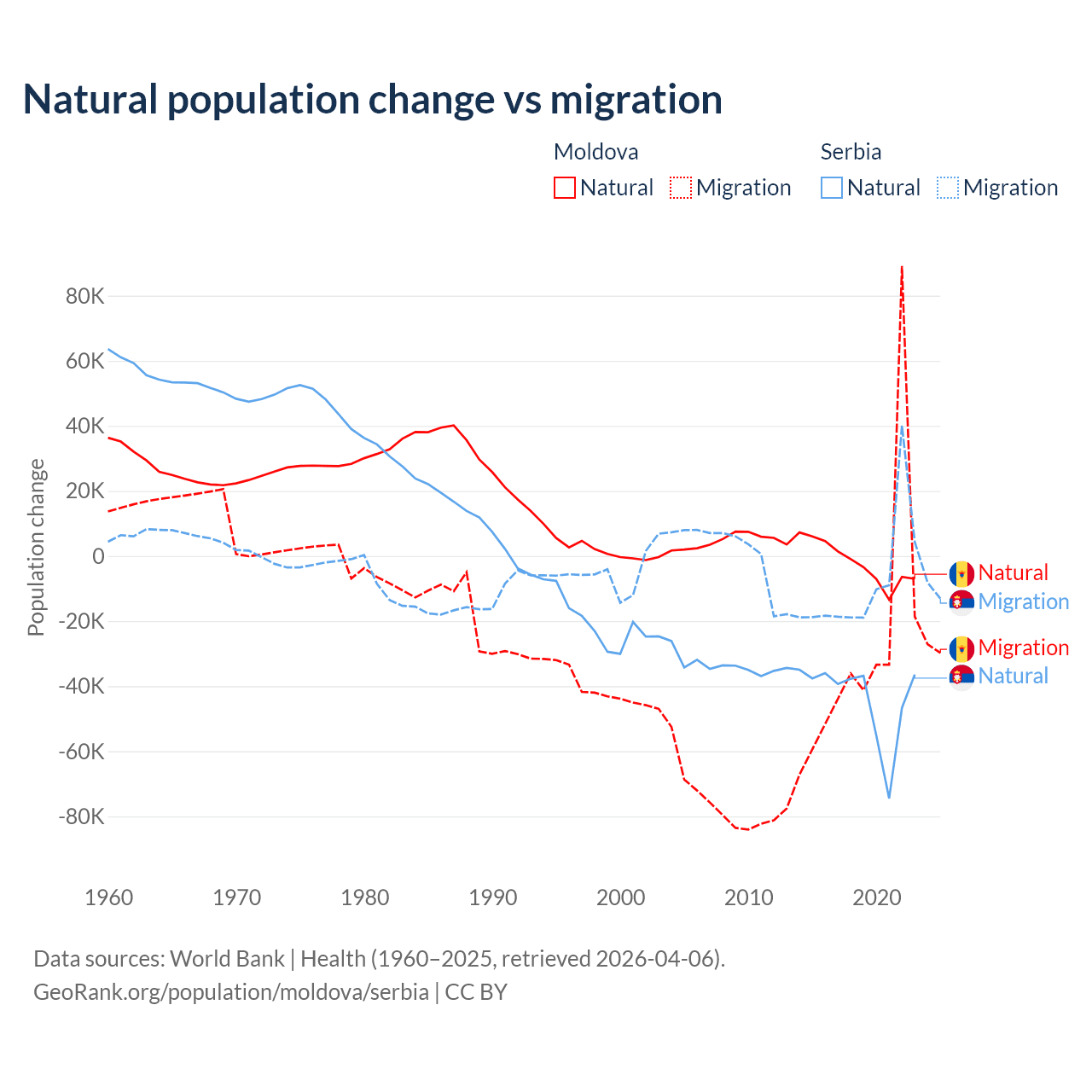Over the last 10 years, 6.04% of the population change in Moldova is from natural causes (a loss of 19,001 people) and 94% is from migration (a loss of 295,631 people). In Serbia 83.3% is from natural causes (a loss of 435,148 people) and 16.7% is from migration (a loss of 87,110 people).