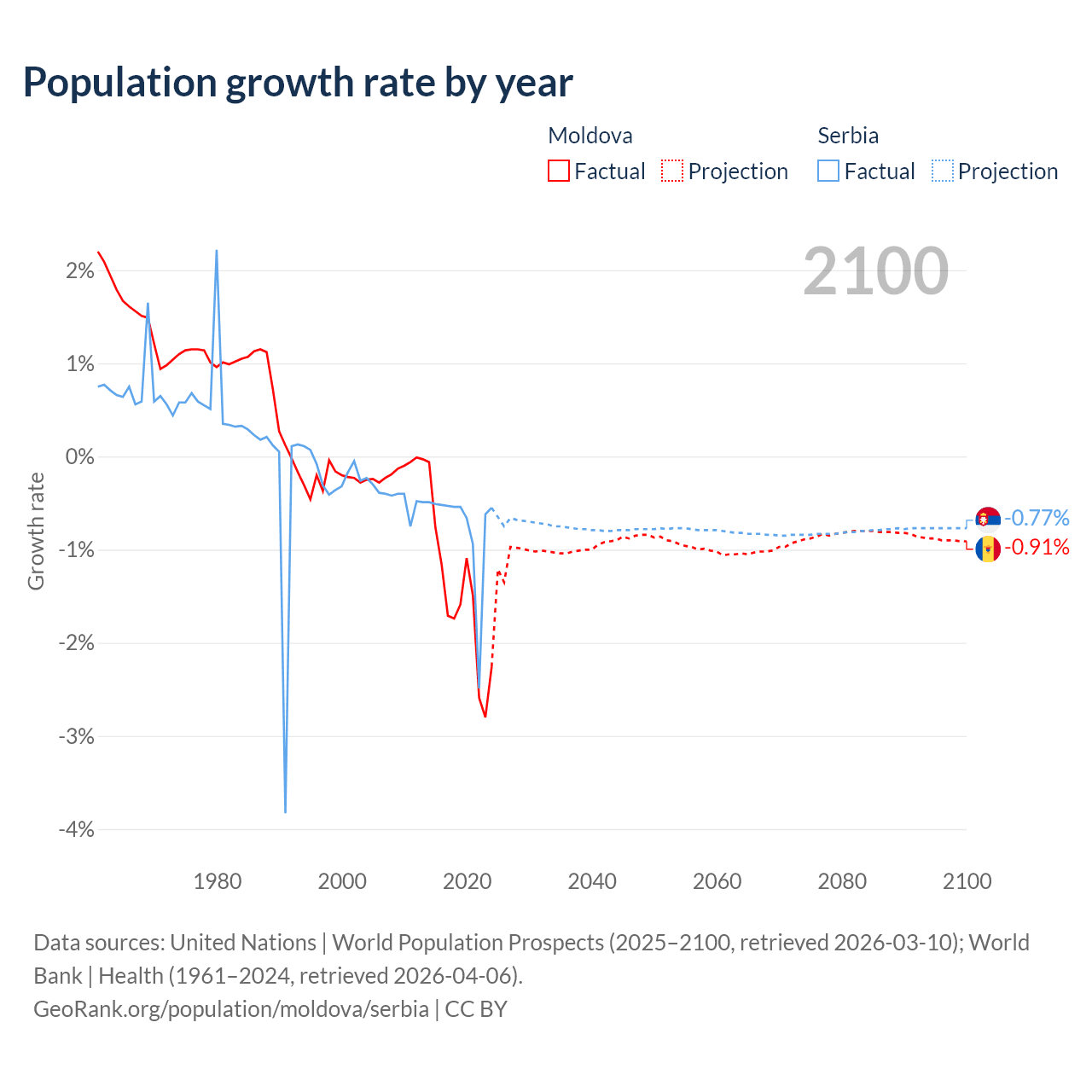 - For the last 10 years, Moldova has had an average growth rate of -1.57% per year vs -0.76% in Serbia.