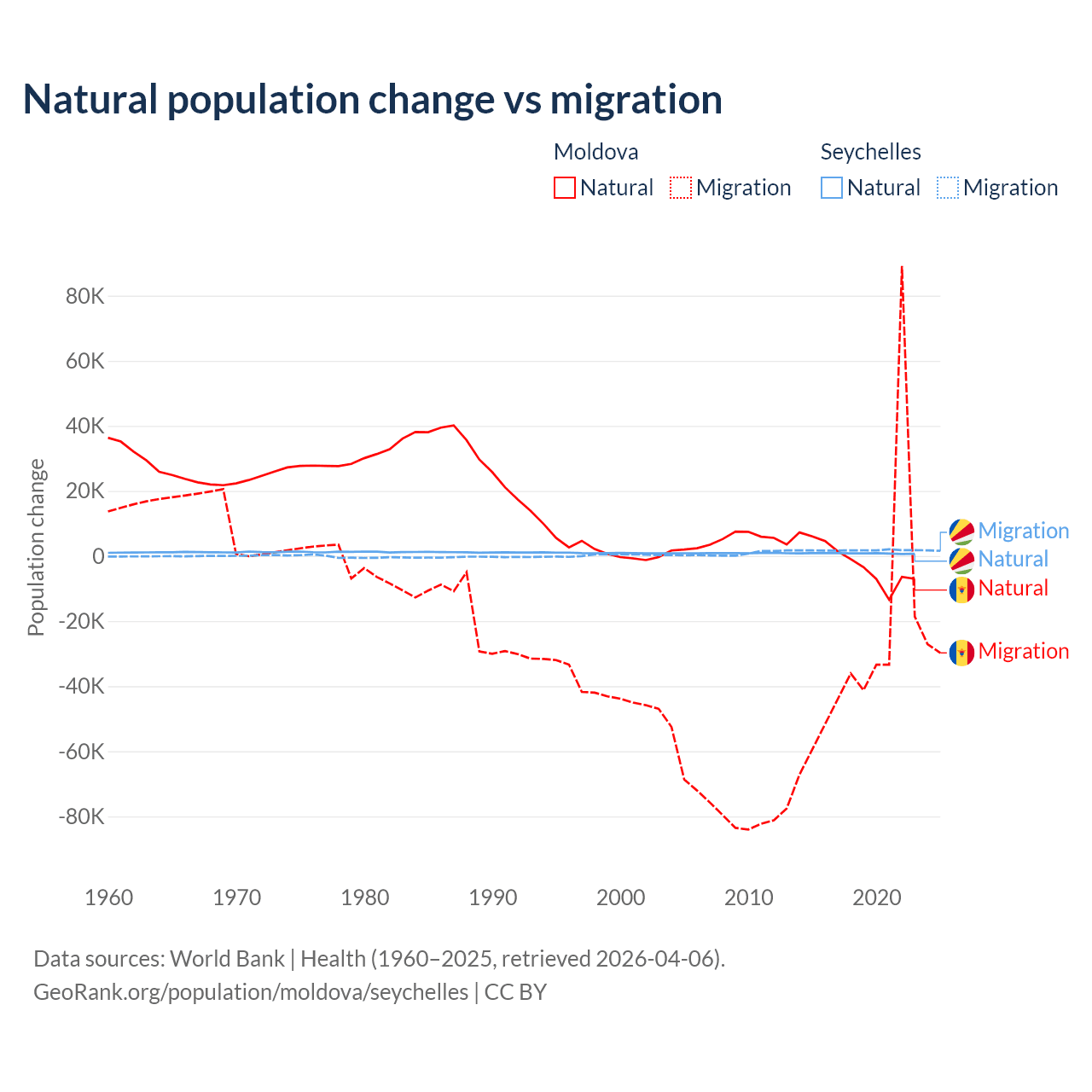 Over the last 10 years, 6.04% of the population change in Moldova is from natural causes (a loss of 19,001 people) and 94% is from migration (a loss of 295,631 people). In the Seychelles 31.4% is from natural causes (a gain of 8,122 people) and 68.6% is from migration (a gain of 17,748 people).