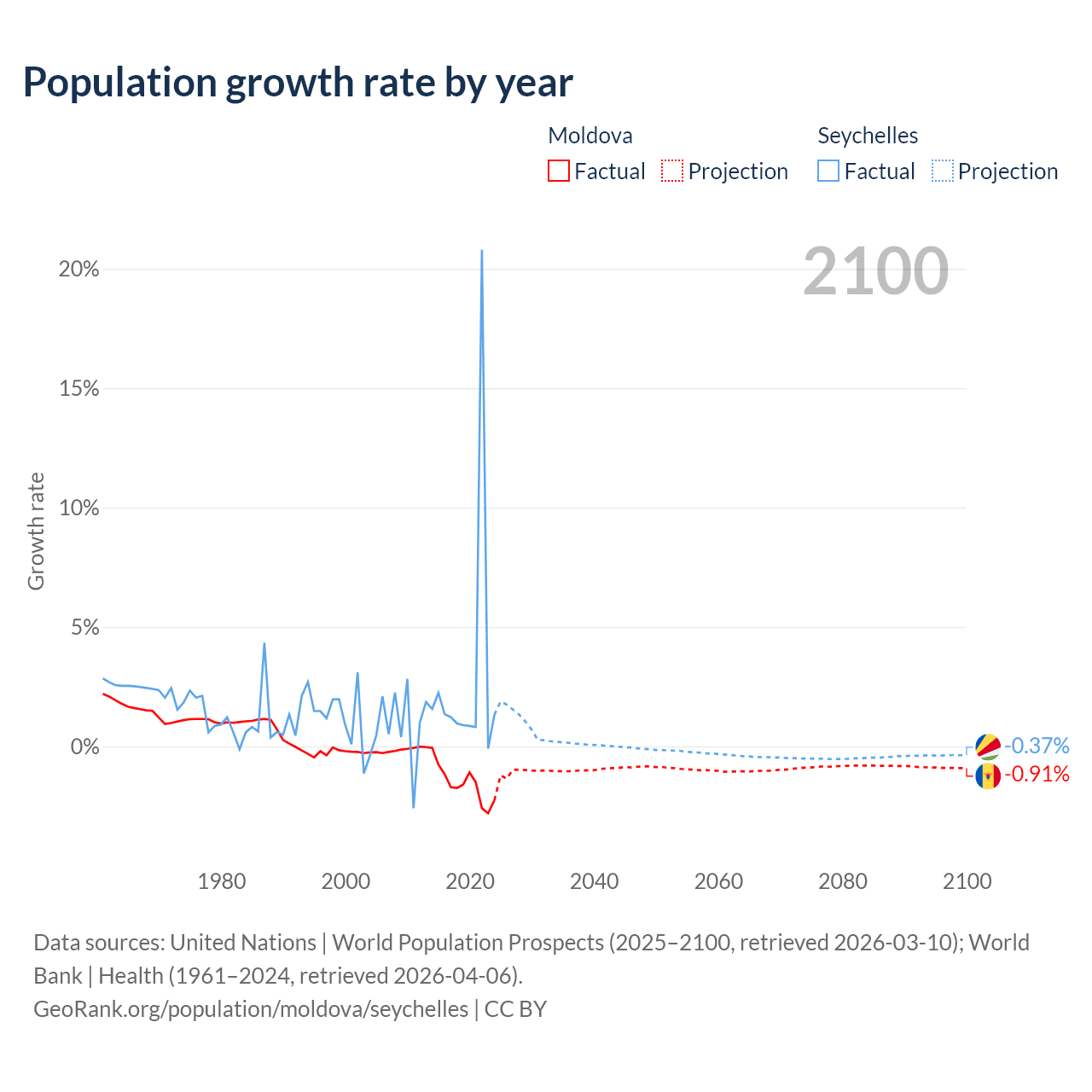 - For the last 10 years, Moldova has had an average growth rate of -1.57% per year vs +2.9% in the Seychelles.
