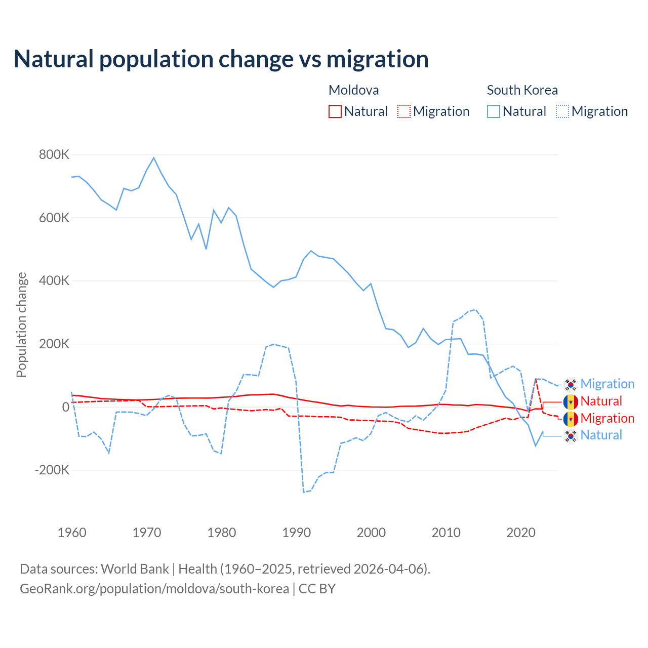 Over the last 10 years, 6.04% of the population change in Moldova is from natural causes (a loss of 19,001 people) and 94% is from migration (a loss of 295,631 people). In South Korea 17.6% is from natural causes (a gain of 277,215 people) and 82.4% is from migration (a gain of 1,298,356 people).