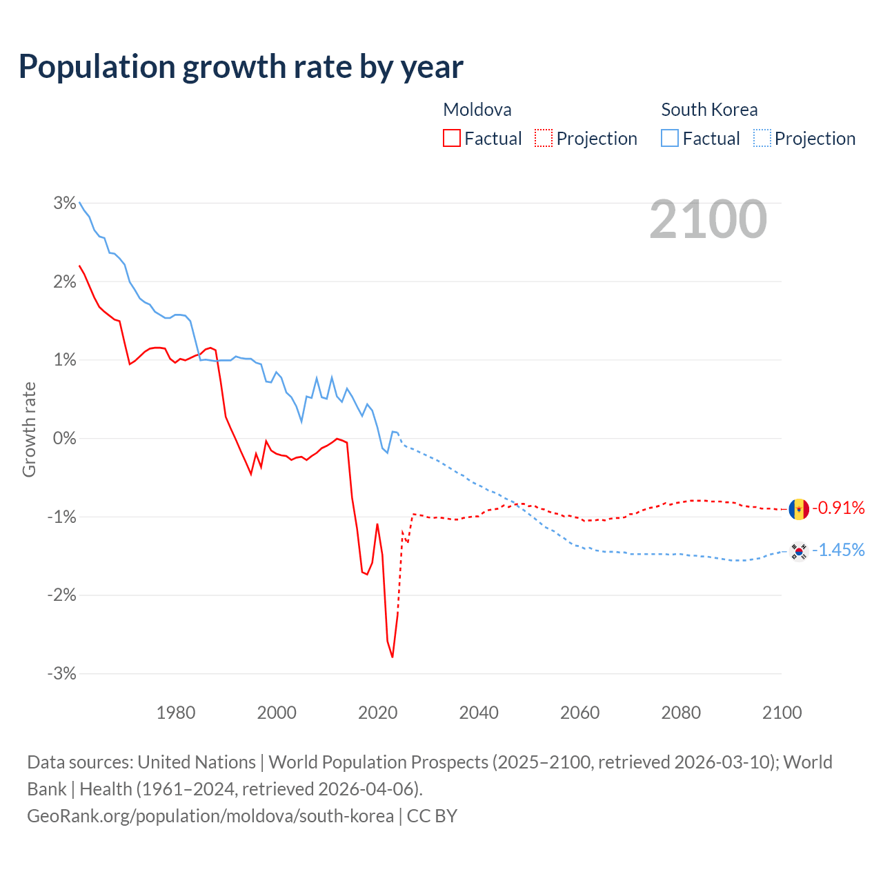 - For the last 10 years, Moldova has had an average growth rate of -1.57% per year vs +0.24% in South Korea.