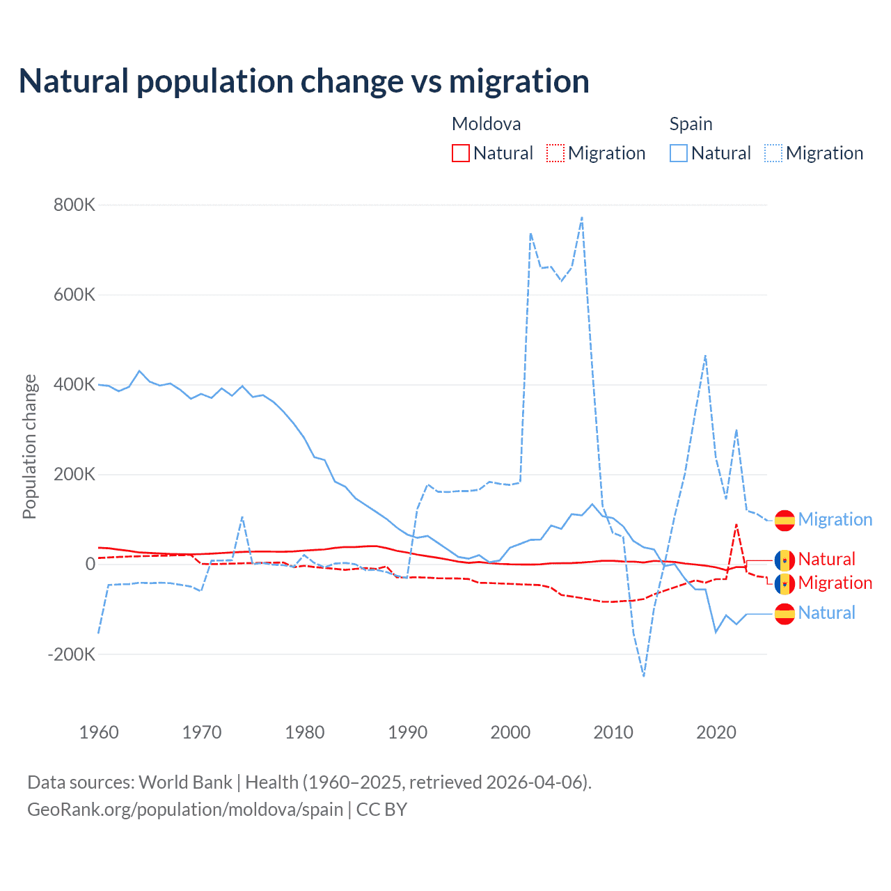 Over the last 10 years, 6.04% of the population change in Moldova is from natural causes (a loss of 19,001 people) and 94% is from migration (a loss of 295,631 people). In Spain 25.8% is from natural causes (a loss of 627,829 people) and 74.2% is from migration (a gain of 1,810,127 people).
