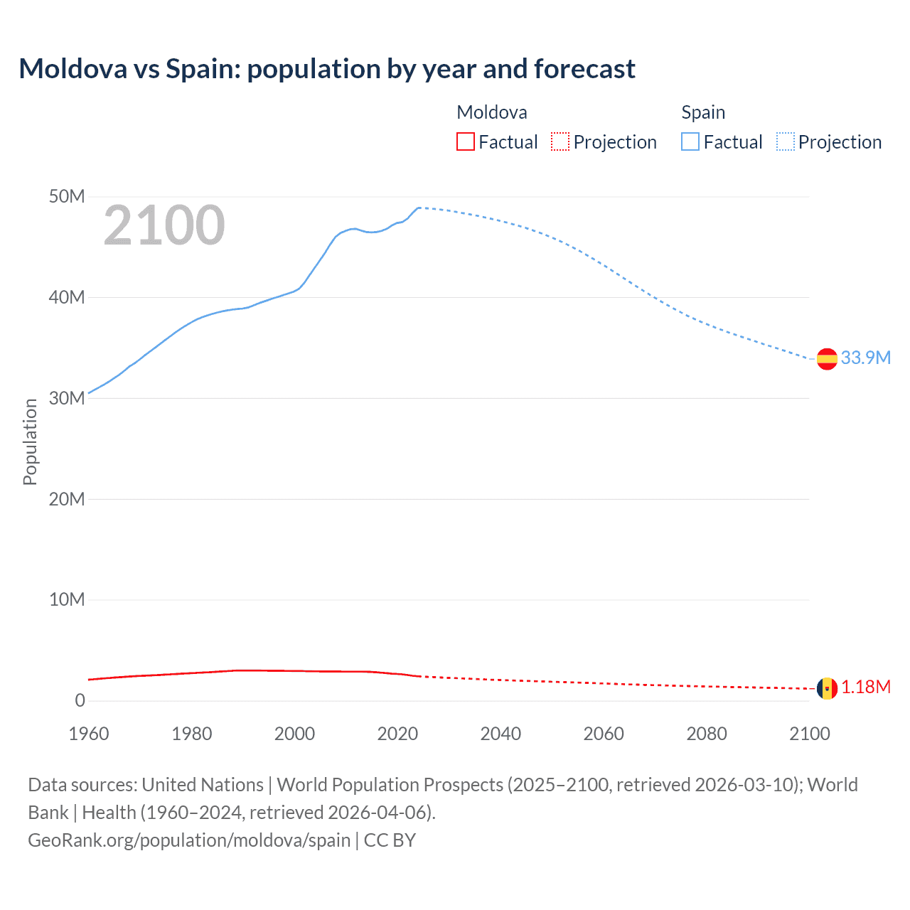 The latest officially reported population of Moldova was 2,402,306 in 2024 vs 48,848,840 people in Spain in 2024. In 2026, based on the adjusted UN estimation, the current Moldova's population is 2,341,166 people compared to 48,806,901 in Spain.