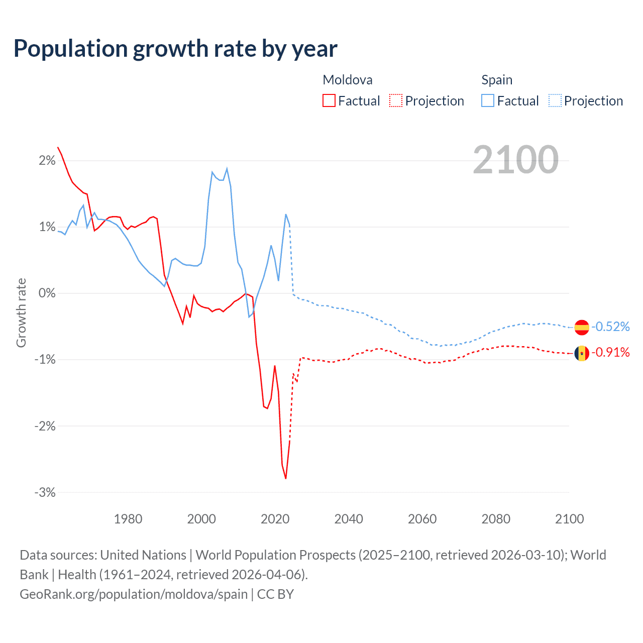 - For the last 10 years, Moldova has had an average growth rate of -1.57% per year vs +0.43% in Spain.
