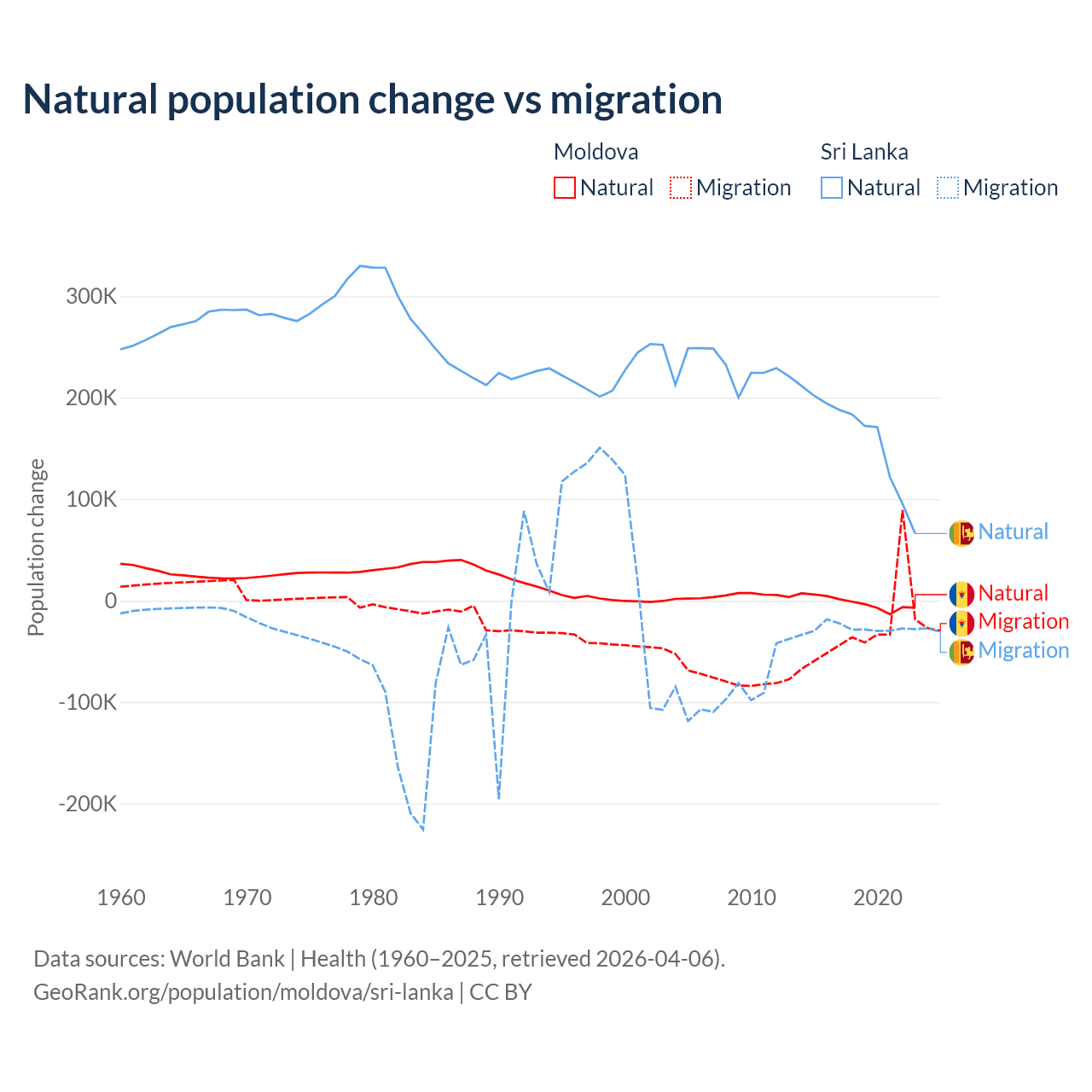 Over the last 10 years, 6.04% of the population change in Moldova is from natural causes (a loss of 19,001 people) and 94% is from migration (a loss of 295,631 people). In Sri Lanka 85.3% is from natural causes (a gain of 1,605,749 people) and 14.7% is from migration (a loss of 276,121 people).