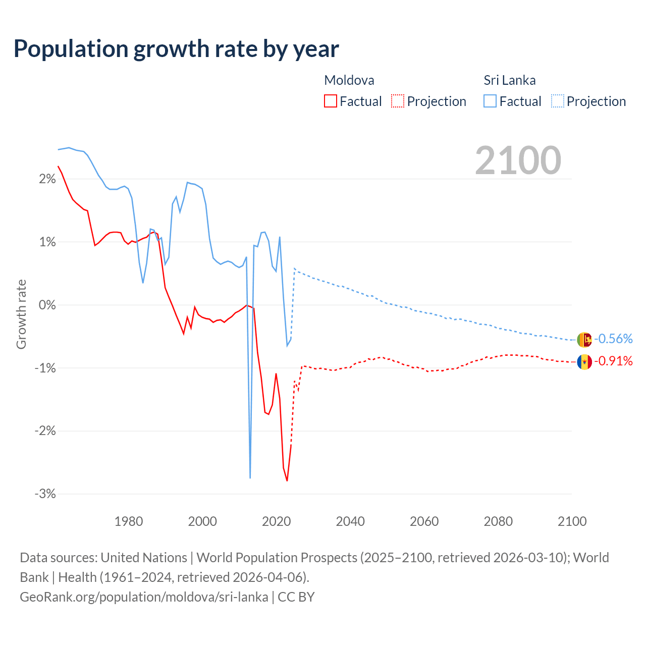 - For the last 10 years, Moldova has had an average growth rate of -1.57% per year vs +0.57% in Sri Lanka.