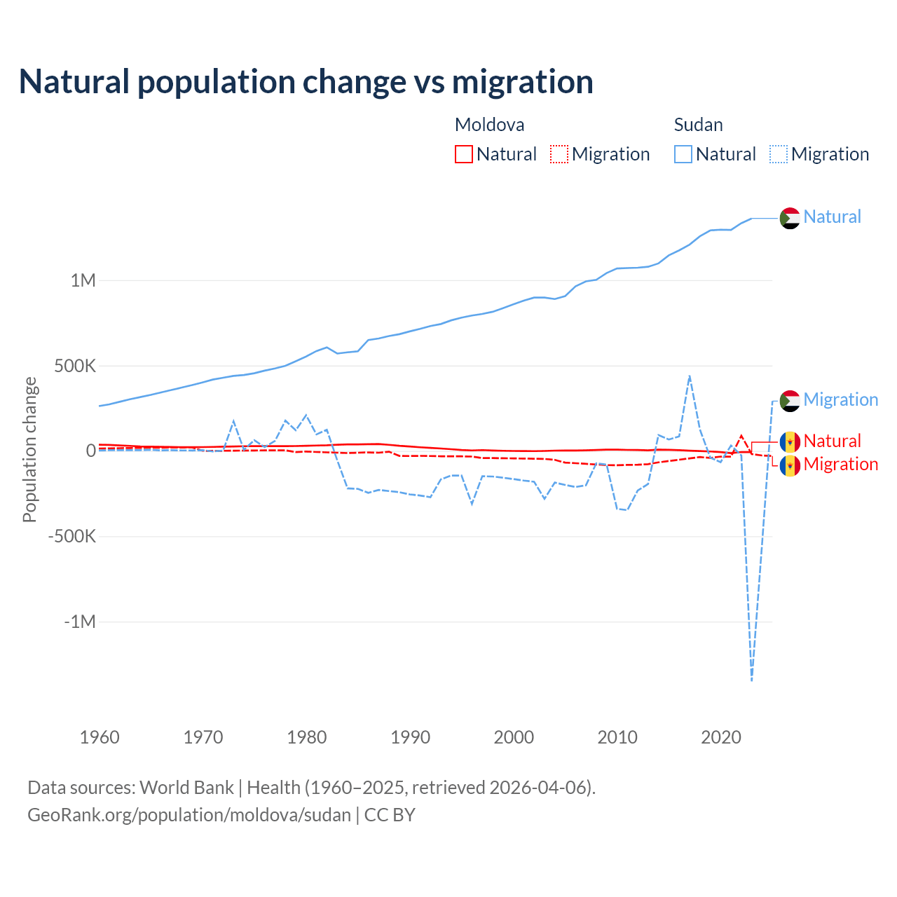 Over the last 10 years, 6.04% of the population change in Moldova is from natural causes (a loss of 19,001 people) and 94% is from migration (a loss of 295,631 people). In Sudan 95.1% is from natural causes (a gain of 12,459,977 people) and 4.88% is from migration (a loss of 639,596 people).