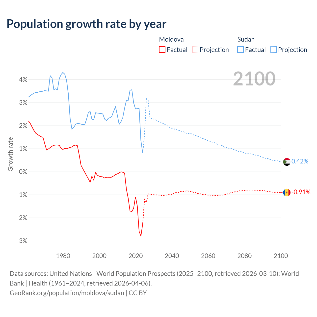 - For the last 10 years, Moldova has had an average growth rate of -1.57% per year vs +2.67% in Sudan.