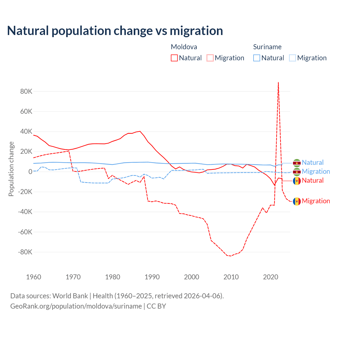 Over the last 10 years, 6.04% of the population change in Moldova is from natural causes (a loss of 19,001 people) and 94% is from migration (a loss of 295,631 people). In Suriname 90.3% is from natural causes (a gain of 66,709 people) and 9.72% is from migration (a loss of 7,185 people).