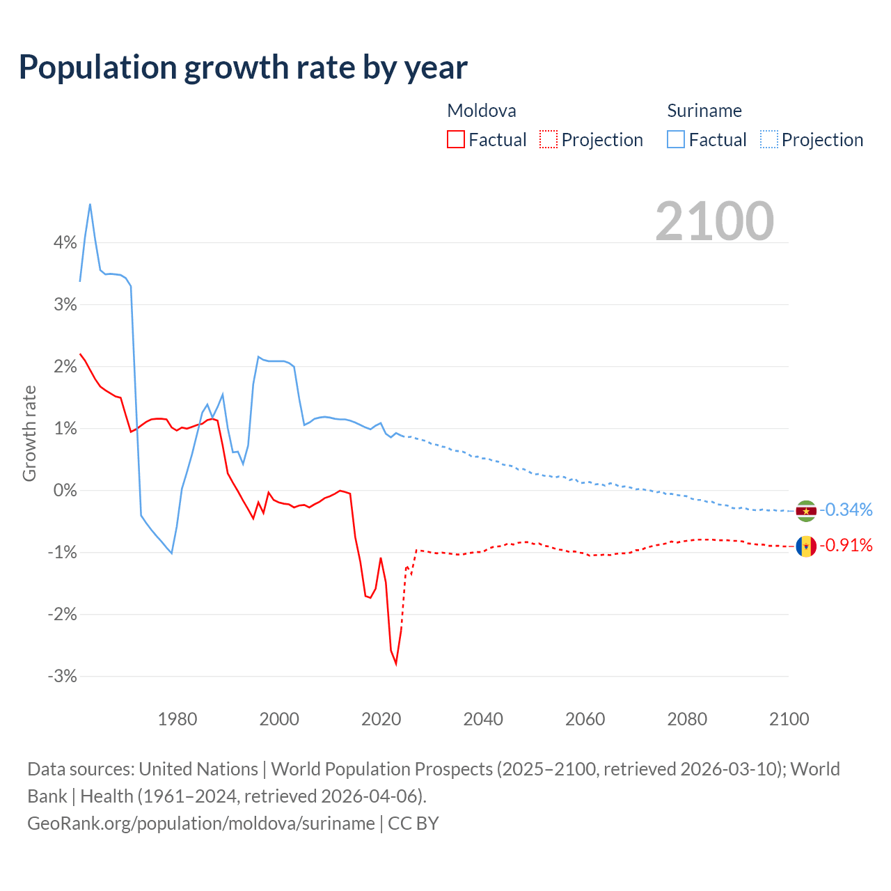 - For the last 10 years, Moldova has had an average growth rate of -1.57% per year vs +0.99% in Suriname.