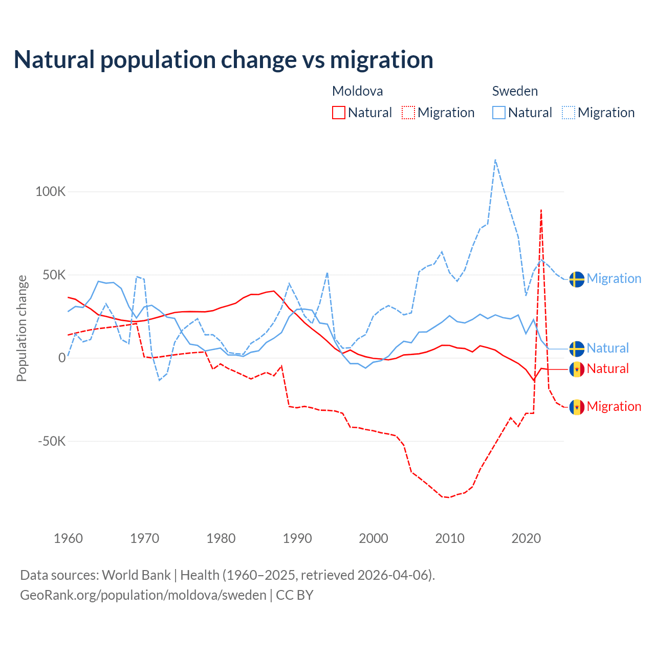 Over the last 10 years, 6.04% of the population change in Moldova is from natural causes (a loss of 19,001 people) and 94% is from migration (a loss of 295,631 people). In Sweden 21.4% is from natural causes (a gain of 201,900 people) and 78.6% is from migration (a gain of 743,642 people).