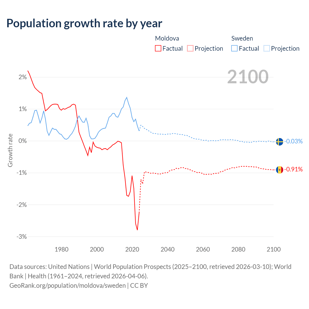 - For the last 10 years, Moldova has had an average growth rate of -1.57% per year vs +0.88% in Sweden.