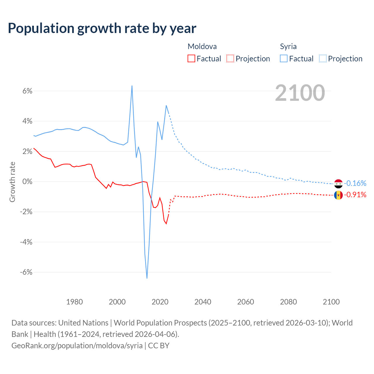 - For the last 10 years, Moldova has had an average growth rate of -1.57% per year vs +1.25% in Syria.