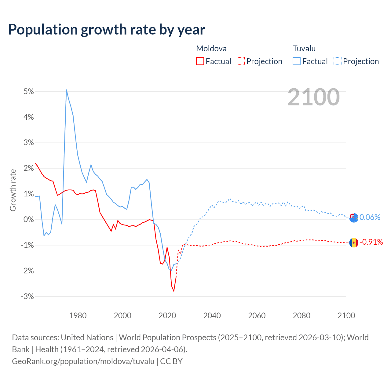 - For the last 10 years, Moldova has had an average growth rate of -1.57% per year vs -1.19% in Tuvalu.