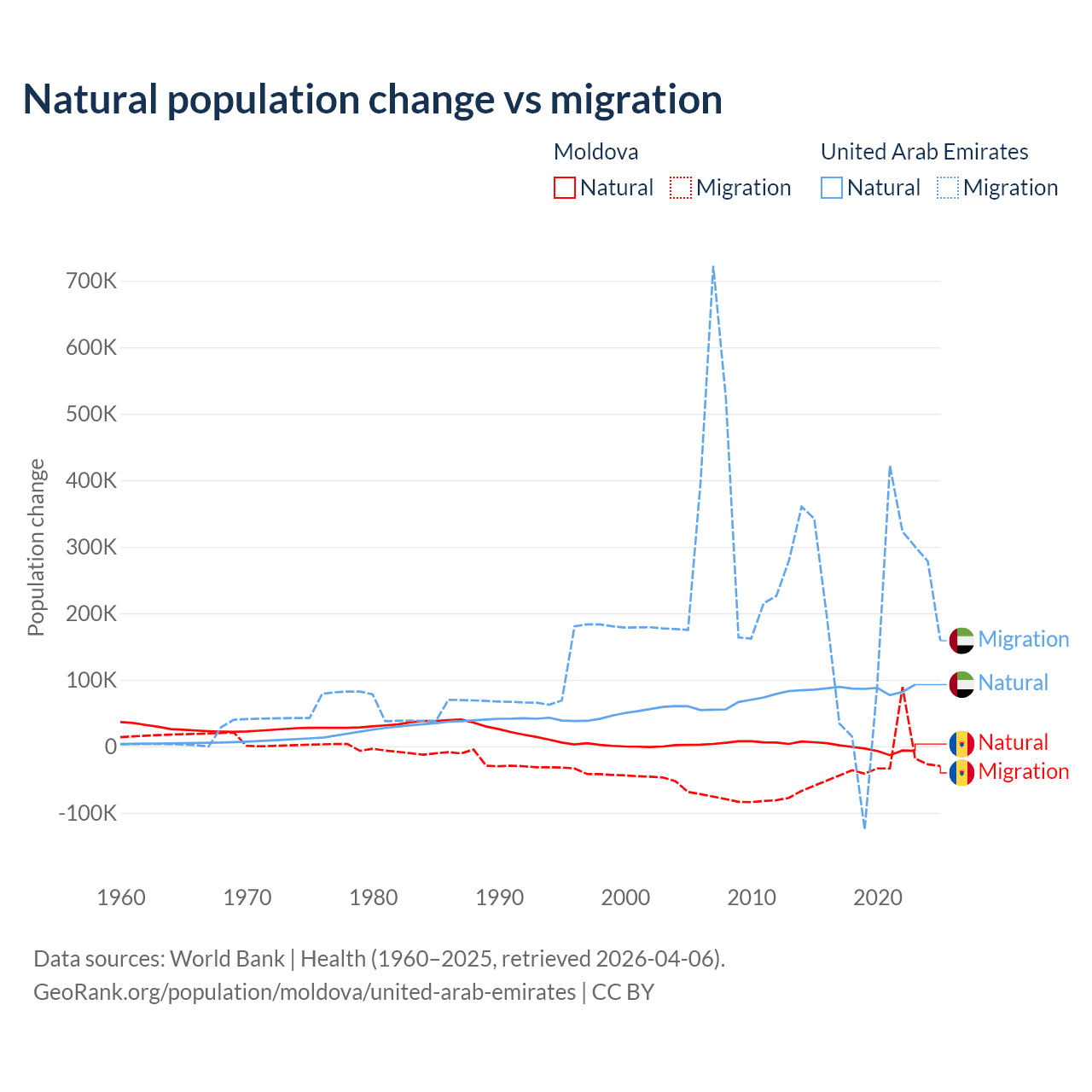 Over the last 10 years, 6.04% of the population change in Moldova is from natural causes (a loss of 19,001 people) and 94% is from migration (a loss of 295,631 people). In the United Arab Emirates 30.5% is from natural causes (a gain of 857,996 people) and 69.5% is from migration (a gain of 1,958,520 people).