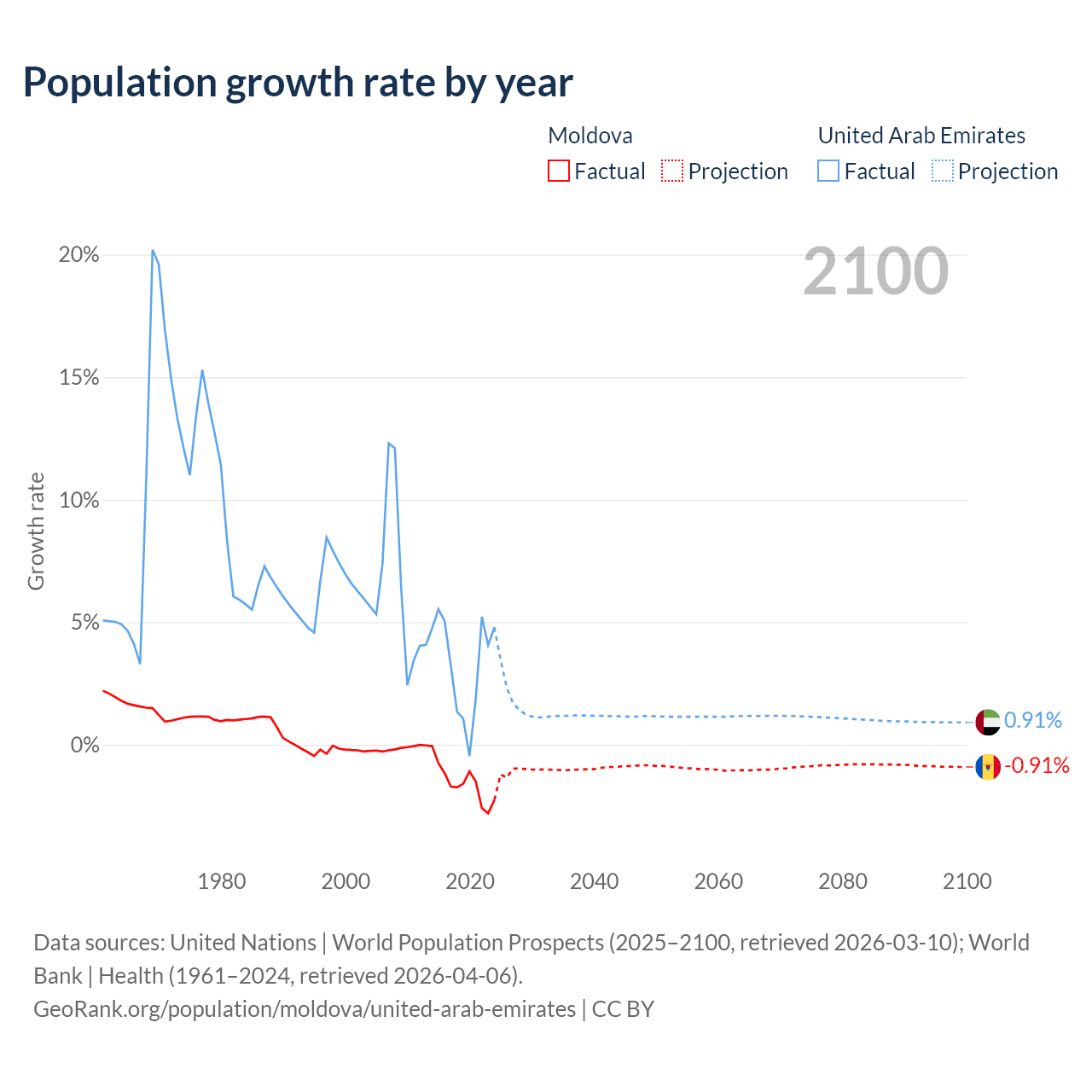 - For the last 10 years, Moldova has had an average growth rate of -1.57% per year vs +3.31% in the United Arab Emirates.