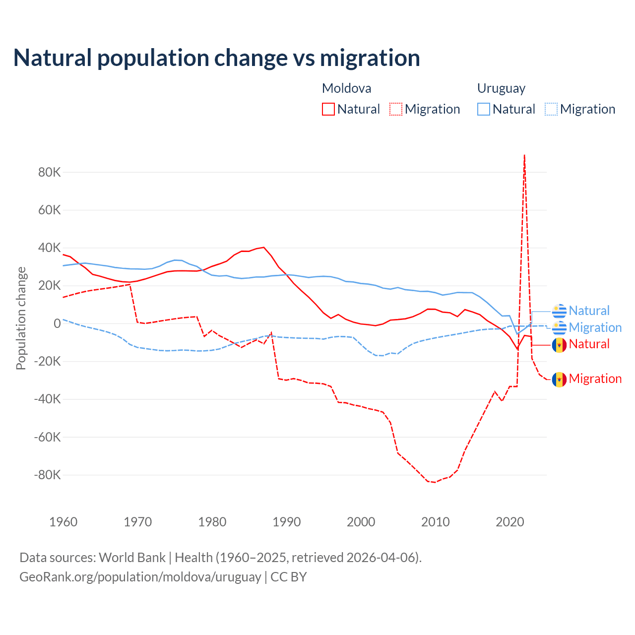 Over the last 10 years, 6.04% of the population change in Moldova is from natural causes (a loss of 19,001 people) and 94% is from migration (a loss of 295,631 people). In Uruguay 70% is from natural causes (a gain of 64,303 people) and 30% is from migration (a loss of 27,501 people).