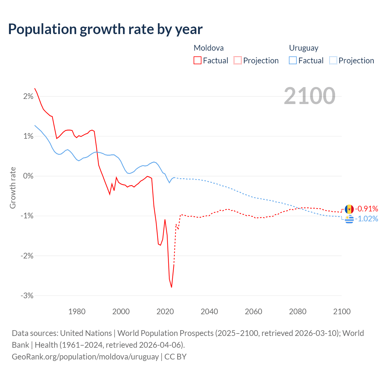 - For the last 10 years, Moldova has had an average growth rate of -1.57% per year vs +0.11% in Uruguay.