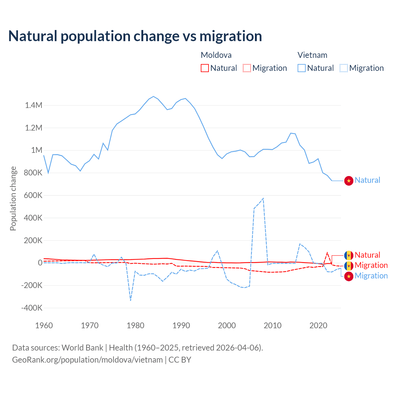 Over the last 10 years, 6.04% of the population change in Moldova is from natural causes (a loss of 19,001 people) and 94% is from migration (a loss of 295,631 people). In Vietnam 97.7% is from natural causes (a gain of 9,349,756 people) and 2.29% is from migration (a gain of 219,073 people).