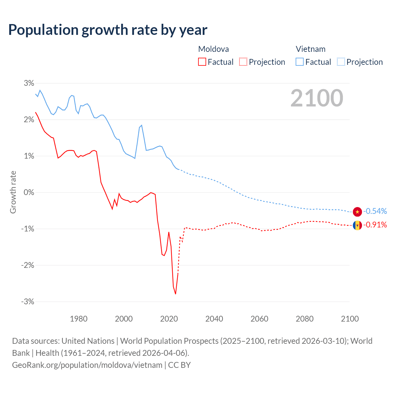 - For the last 10 years, Moldova has had an average growth rate of -1.57% per year vs +0.99% in Vietnam.