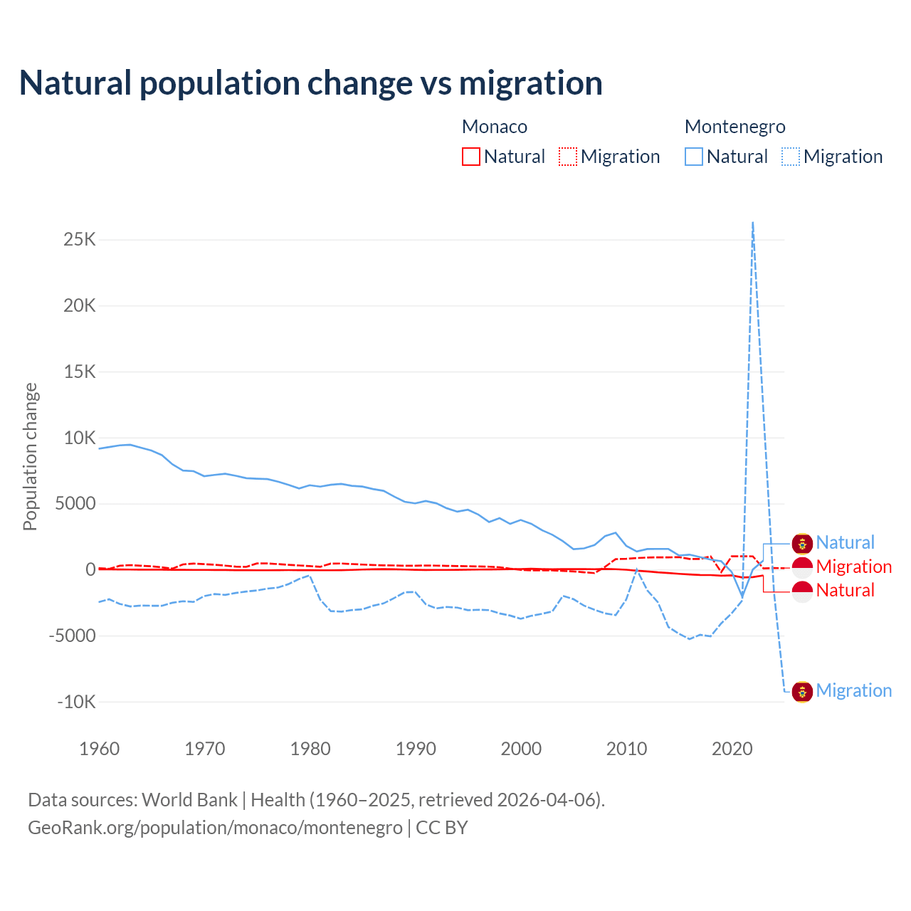 Over the last 10 years, 37.3% of the population change in Monaco is from natural causes (a loss of 4,357 people) and 62.7% is from migration (a gain of 7,333 people). In Montenegro 52.4% is from natural causes (a gain of 4,501 people) and 47.6% is from migration (a gain of 4,095 people).