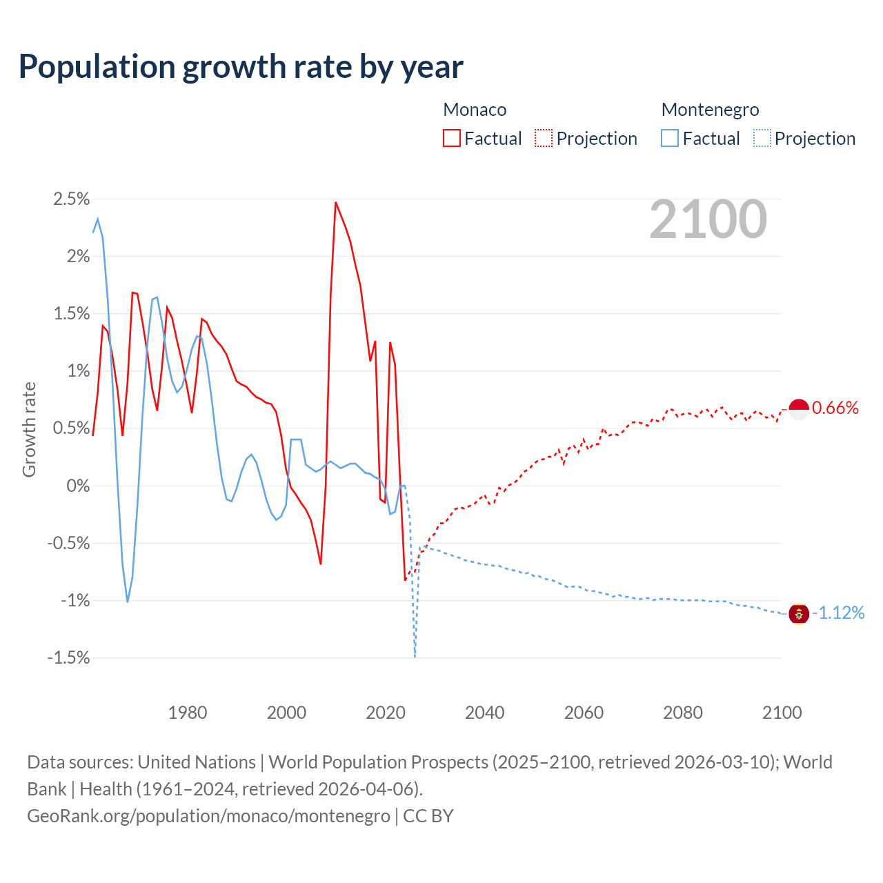 - For the last 10 years, Monaco has had an average growth rate of +0.79% per year vs +0.01% in Montenegro.