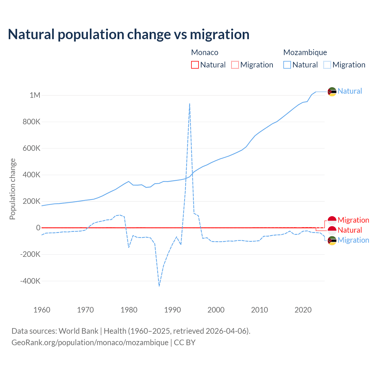 Over the last 10 years, 37.3% of the population change in Monaco is from natural causes (a loss of 4,357 people) and 62.7% is from migration (a gain of 7,333 people). In Mozambique 95.9% is from natural causes (a gain of 9,108,203 people) and 4.15% is from migration (a loss of 393,923 people).