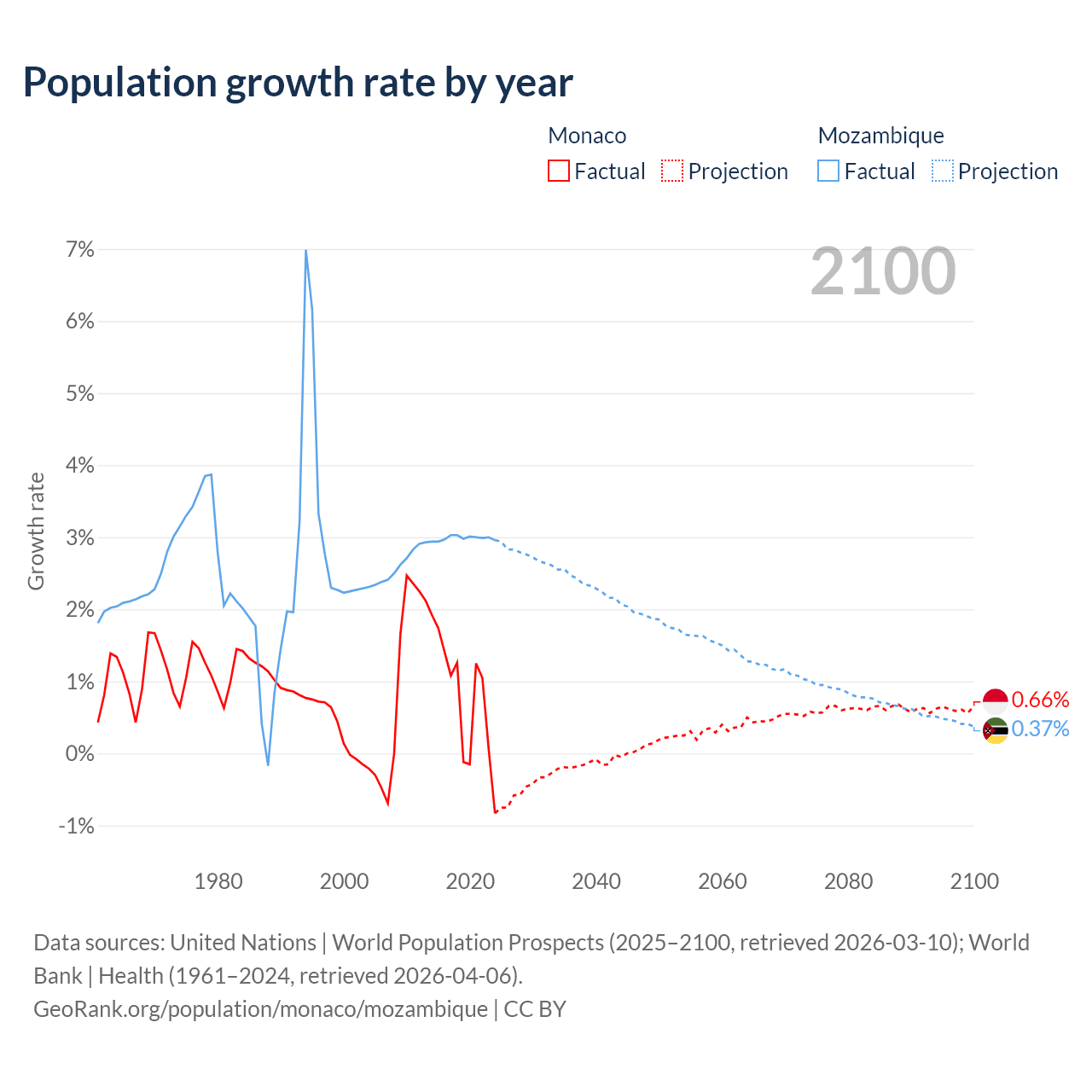 - For the last 10 years, Monaco has had an average growth rate of +0.79% per year vs +2.99% in Mozambique.