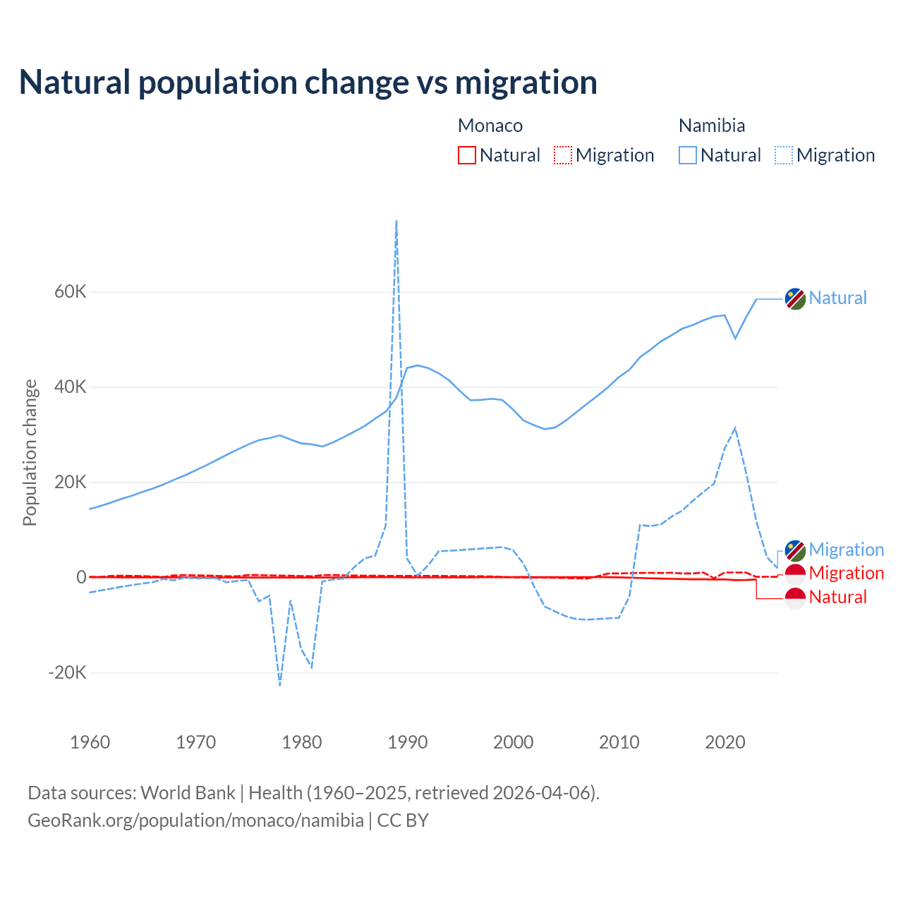 Over the last 10 years, 37.3% of the population change in Monaco is from natural causes (a loss of 4,357 people) and 62.7% is from migration (a gain of 7,333 people). In Namibia 74.3% is from natural causes (a gain of 532,532 people) and 25.7% is from migration (a gain of 183,837 people).