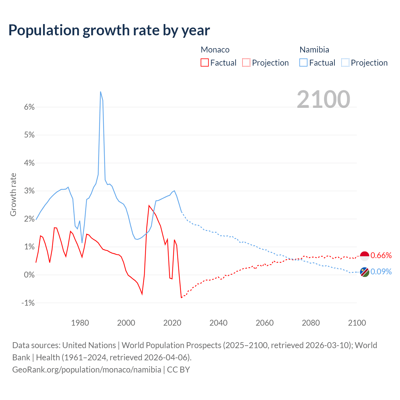 - For the last 10 years, Monaco has had an average growth rate of +0.79% per year vs +2.73% in Namibia.