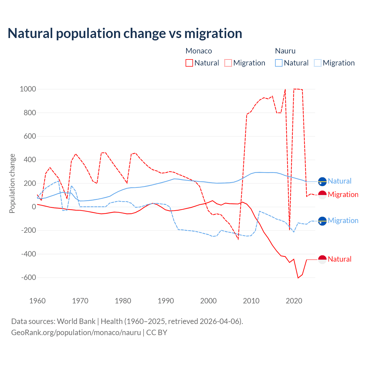 Over the last 10 years, 37.3% of the population change in Monaco is from natural causes (a loss of 4,357 people) and 62.7% is from migration (a gain of 7,333 people). In Nauru 66.2% is from natural causes (a gain of 2,590 people) and 33.8% is from migration (a loss of 1,320 people).