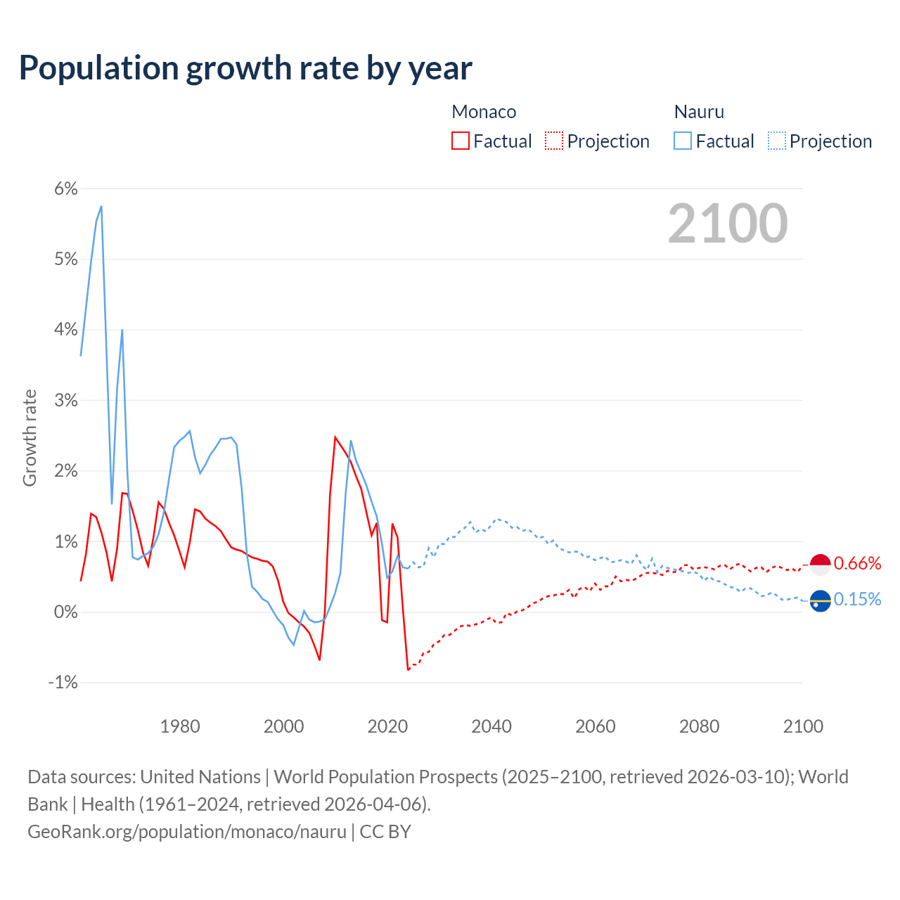 - For the last 10 years, Monaco has had an average growth rate of +0.79% per year vs +1.17% in Nauru.