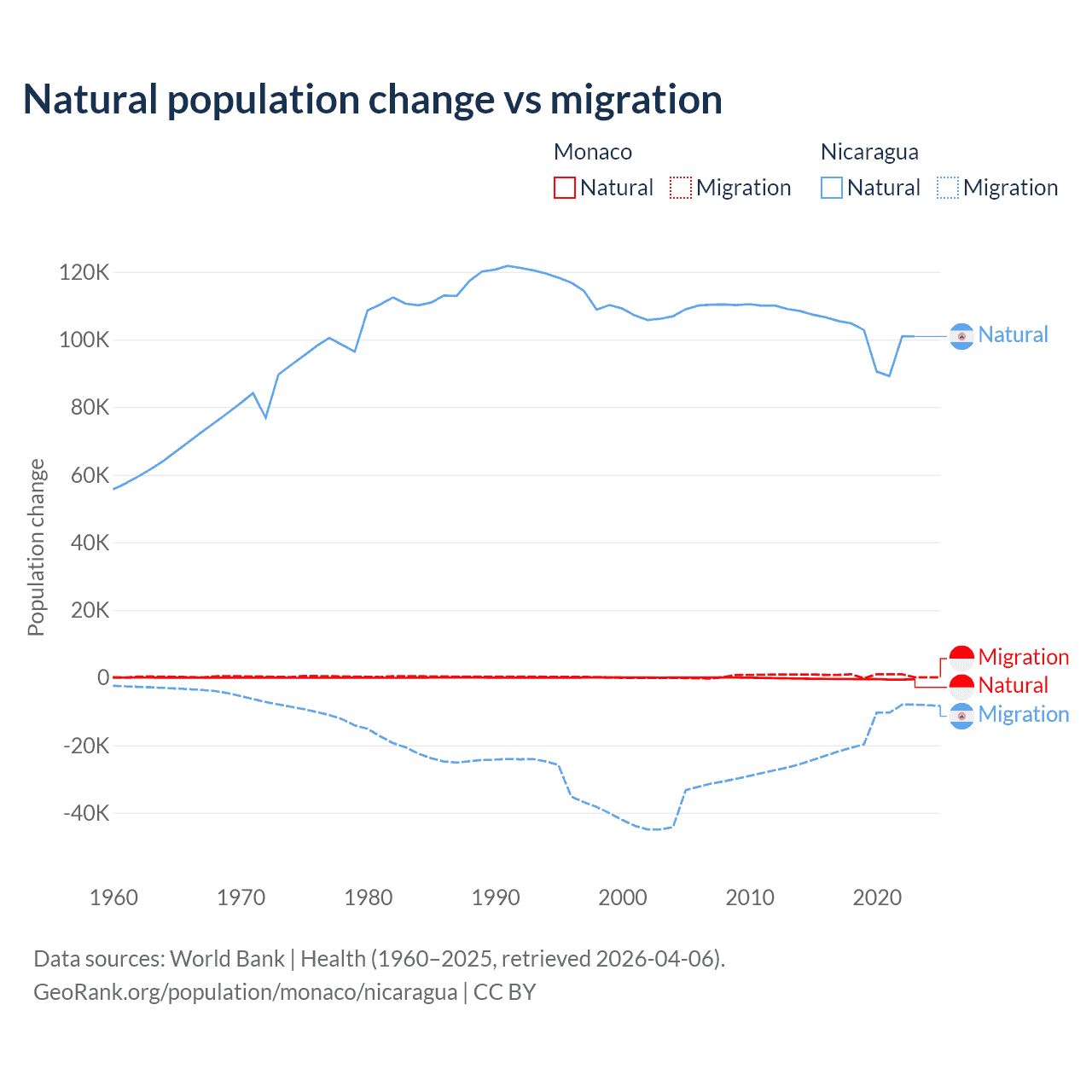 Over the last 10 years, 37.3% of the population change in Monaco is from natural causes (a loss of 4,357 people) and 62.7% is from migration (a gain of 7,333 people). In Nicaragua 85.5% is from natural causes (a gain of 1,017,084 people) and 14.5% is from migration (a loss of 172,078 people).