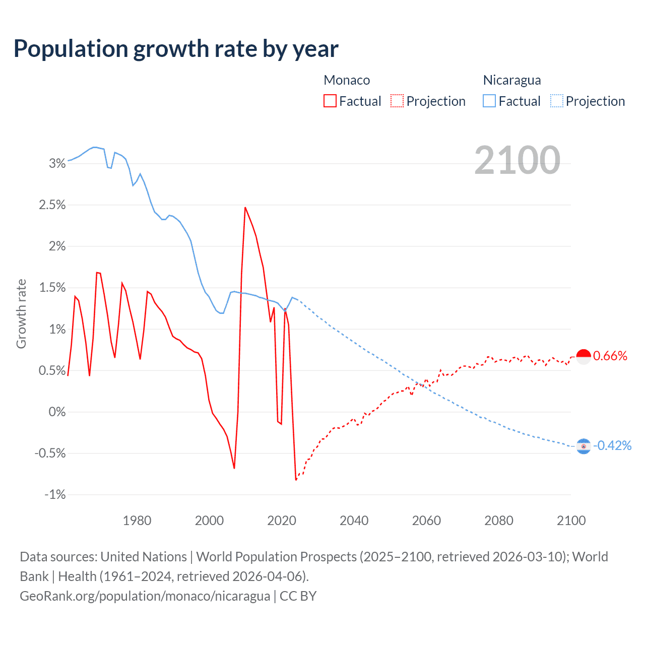 - For the last 10 years, Monaco has had an average growth rate of +0.79% per year vs +1.33% in Nicaragua.