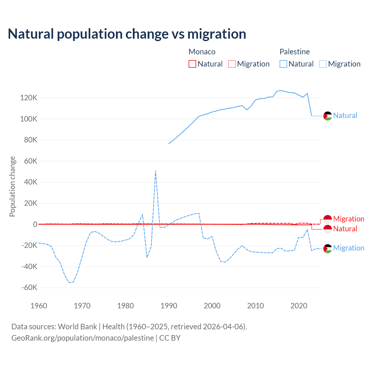 Over the last 10 years, 37.3% of the population change in Monaco is from natural causes (a loss of 4,357 people) and 62.7% is from migration (a gain of 7,333 people). In Palestine 85.7% is from natural causes (a gain of 1,218,010 people) and 14.3% is from migration (a loss of 202,820 people).