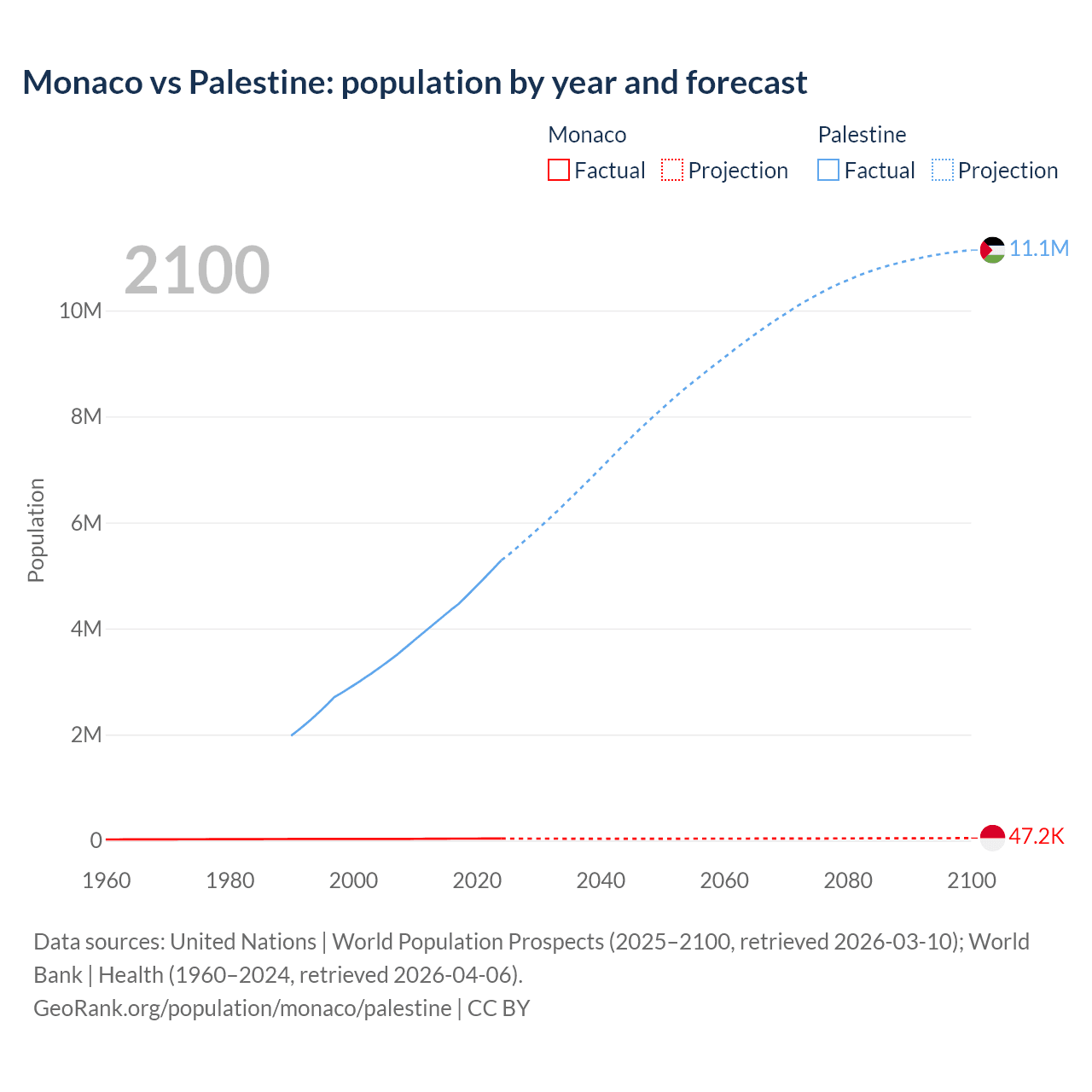 The latest officially reported population of Monaco was 38,631 in 2024 vs 5,289,152 people in Palestine in 2024. In 2026, based on the adjusted UN estimation, the current Monaco's population is 38,053 people compared to 5,500,288 in Palestine.