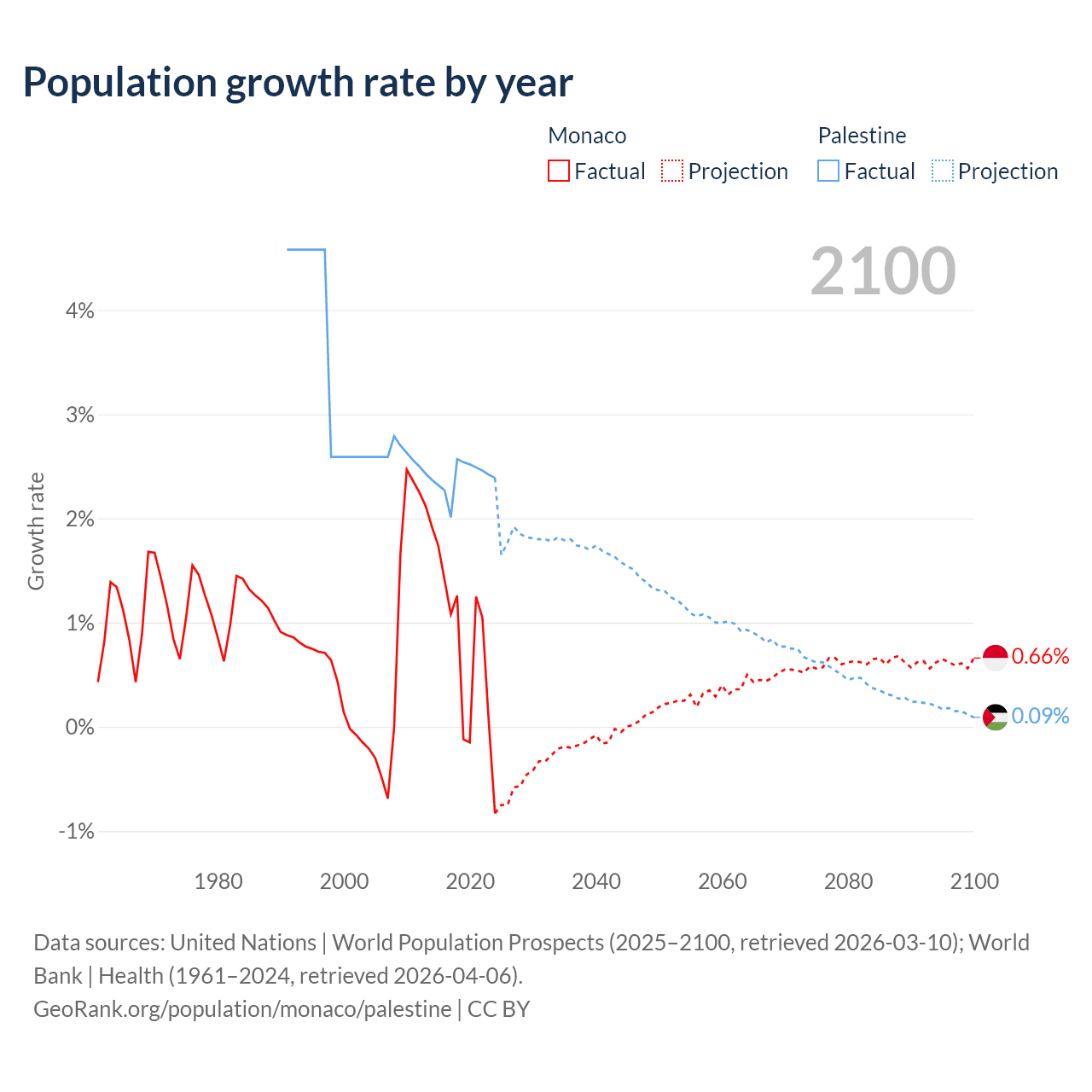 - For the last 10 years, Monaco has had an average growth rate of +0.79% per year vs +2.4% in Palestine.