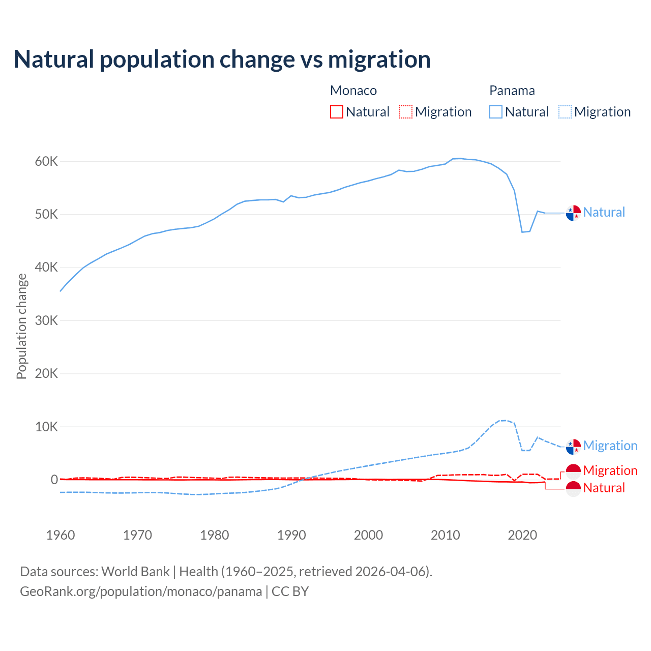 Over the last 10 years, 37.3% of the population change in Monaco is from natural causes (a loss of 4,357 people) and 62.7% is from migration (a gain of 7,333 people). In Panama 86.5% is from natural causes (a gain of 544,211 people) and 13.5% is from migration (a gain of 84,849 people).
