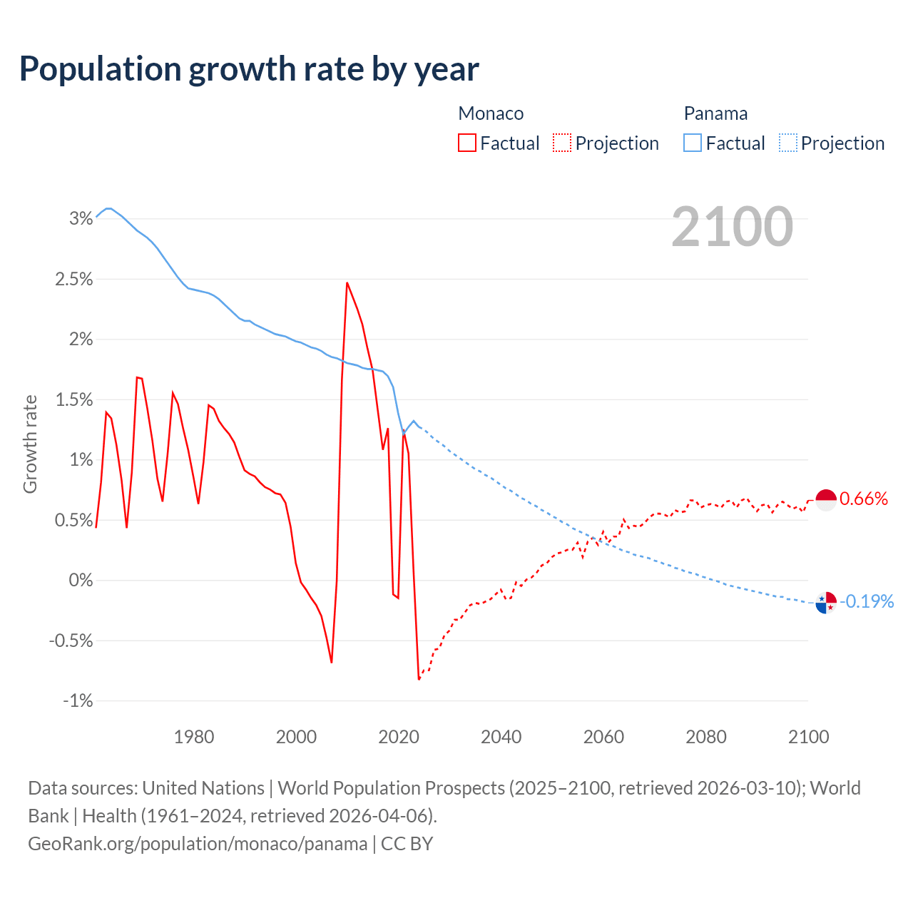 - For the last 10 years, Monaco has had an average growth rate of +0.79% per year vs +1.52% in Panama.