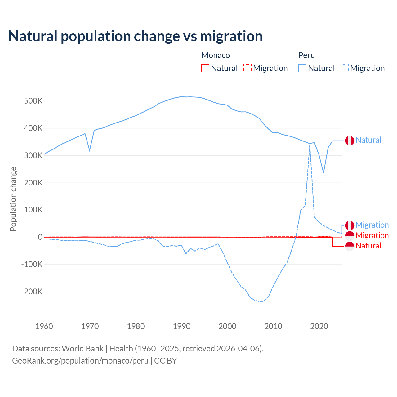 Over the last 10 years, 37.3% of the population change in Monaco is from natural causes (a loss of 4,357 people) and 62.7% is from migration (a gain of 7,333 people). In Peru 82% is from natural causes (a gain of 3,345,822 people) and 18% is from migration (a gain of 732,505 people).