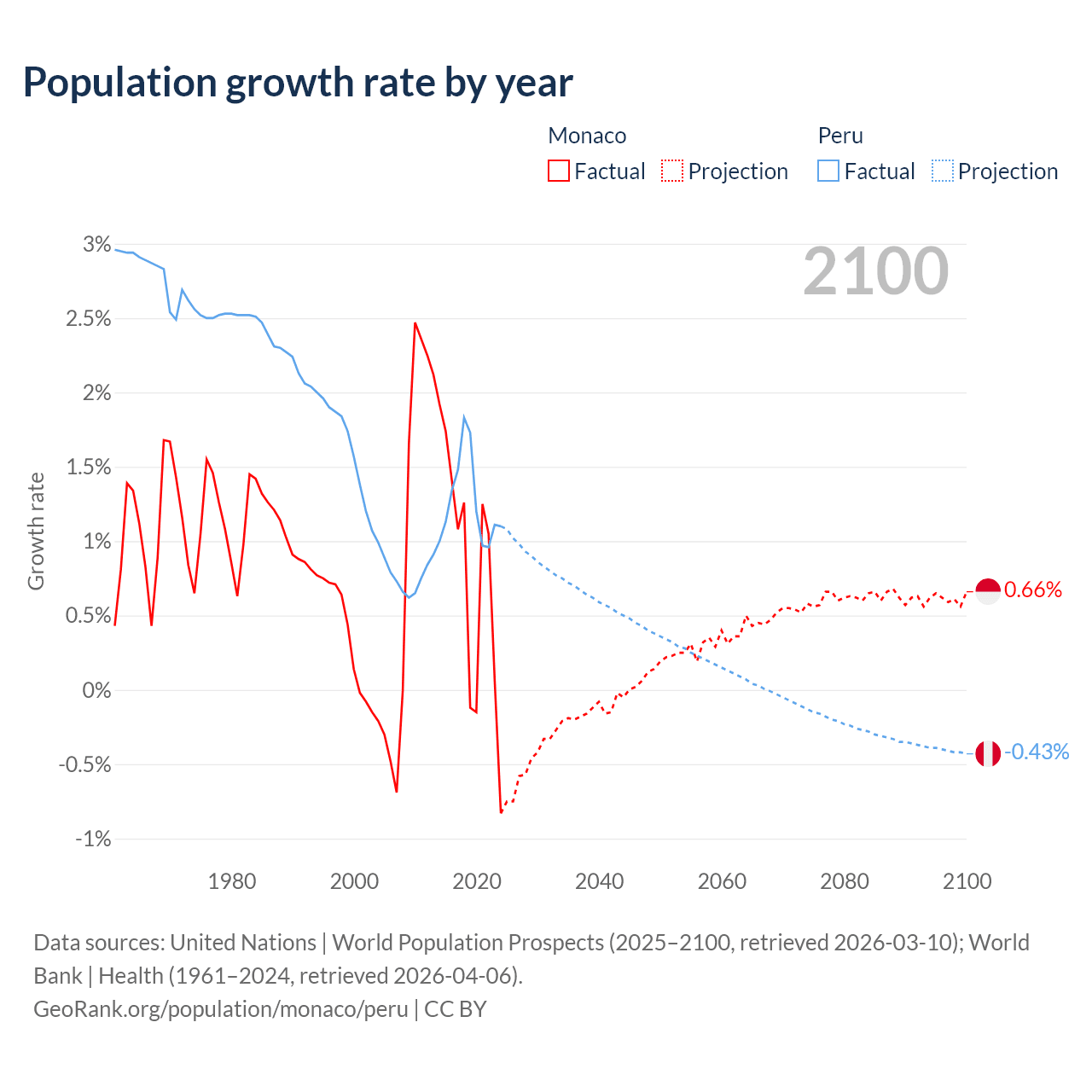 - For the last 10 years, Monaco has had an average growth rate of +0.79% per year vs +1.26% in Peru.