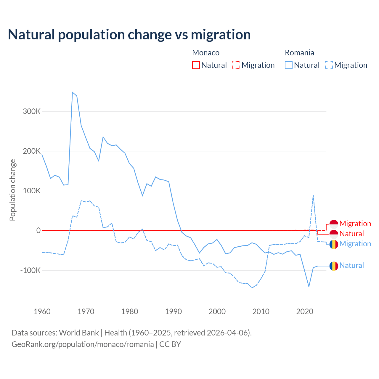 Over the last 10 years, 37.3% of the population change in Monaco is from natural causes (a loss of 4,357 people) and 62.7% is from migration (a gain of 7,333 people). In Romania 82% is from natural causes (a loss of 766,295 people) and 18% is from migration (a loss of 167,917 people).
