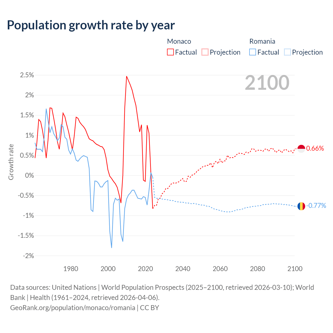 - For the last 10 years, Monaco has had an average growth rate of +0.79% per year vs -0.43% in Romania.